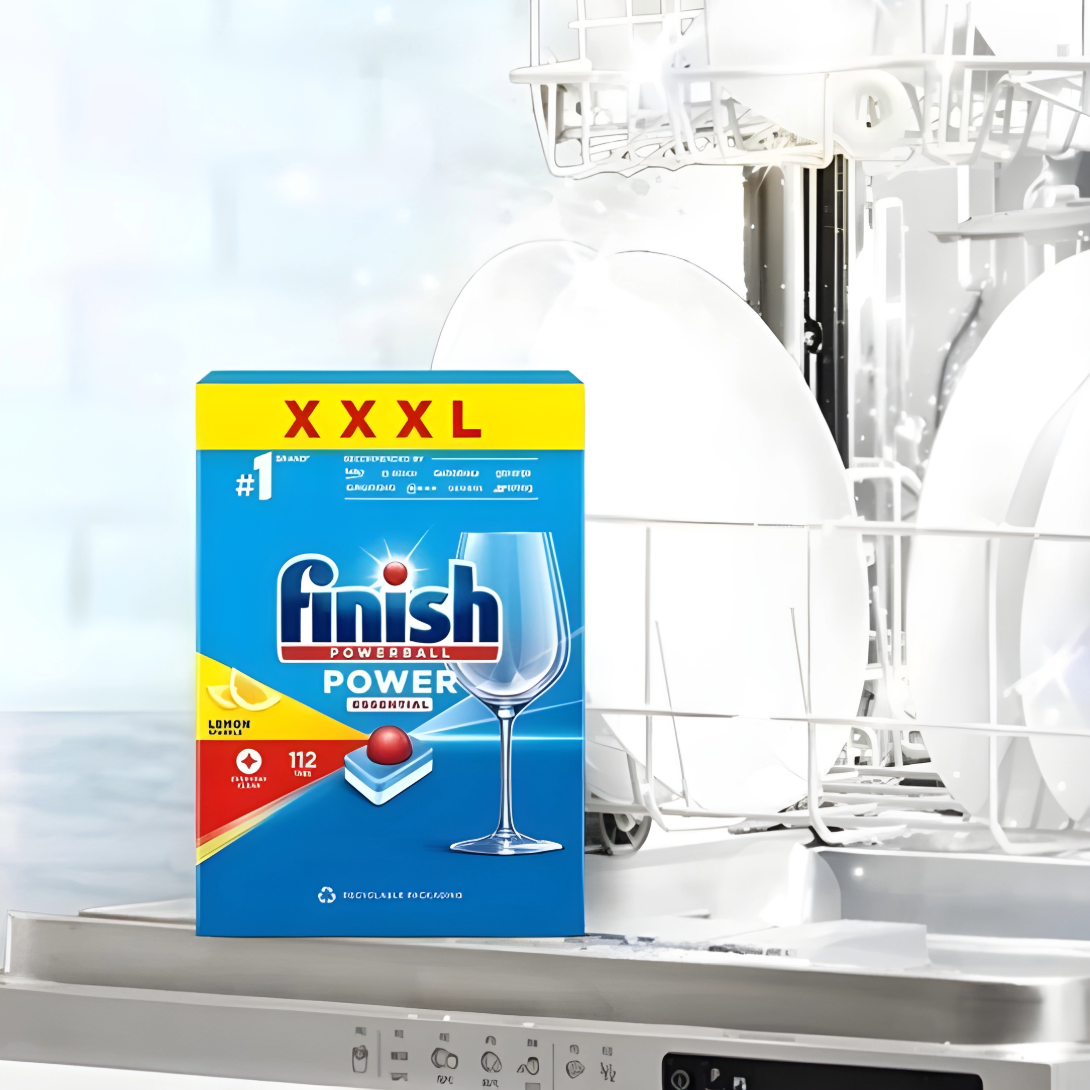 FINISH POWERBALL Lemon Sparkle tablete za pranje posuđa SUPER FORMULA (čak 80 tableta) osmišljene su za one koji zahtijevaju profesionalne rezultate i u najzahtjevnijim uvjetima – ugostiteljstvo, kuhinje i svakodnevna intenzivna upotreba. Njegova visoko koncentrirana formula s limunom osigurava blistavo čisto posuđe već nakon prvog pranja – bez prethodnog ispiranja i bez ostataka.